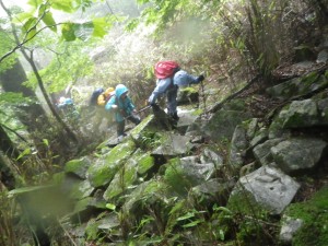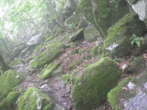 | 急斜面は滑りやすい | ツツジが咲いていた | 苔むした岩 |