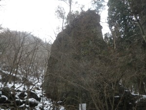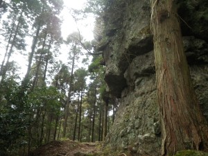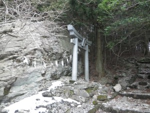 | 滝が有名になってこんな看板が | 岩壁横を通過 | 智室神社の鳥居から梵字岩への階段(13:18) |