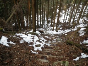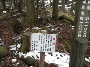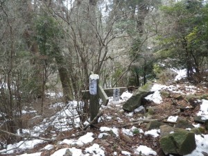 | 鬼杉との分岐(12:46) | 大南神社との分岐は奉幣殿へ(12:47) | 登山道の雪は溶けている |