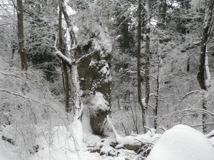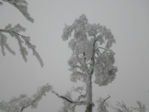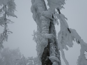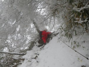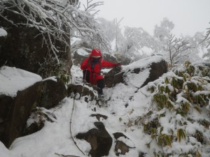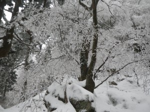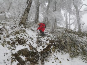 | 雪を被った巨石 | 樹氷が素晴らしい | 岩場を登る登山者 |