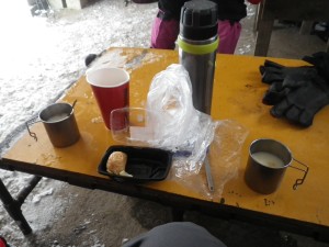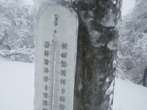 | 北岳山頂にある道標(12:46) | 北岳で小休憩 | 温度計は氷で覆われていた |