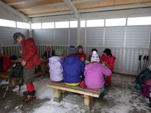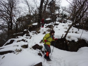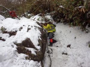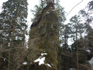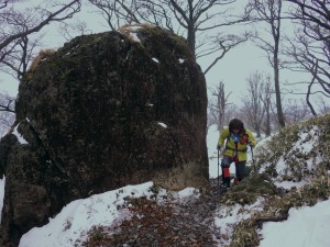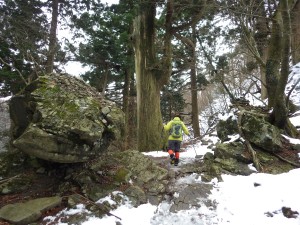 | 東屋で休憩してアイゼンを装着(10:30) | 雪は次第に深くなる | 巨石と巨木 |