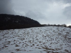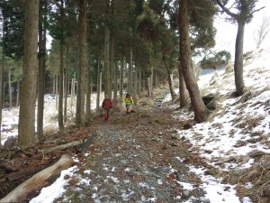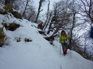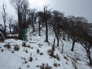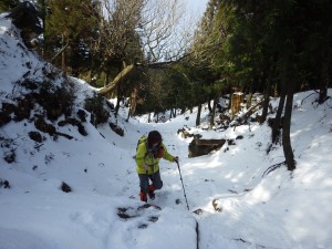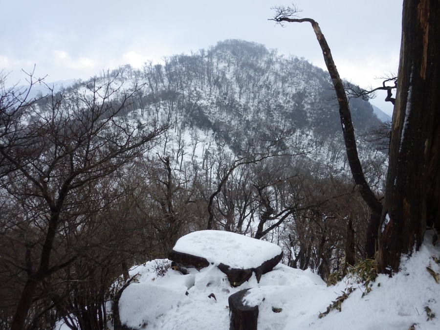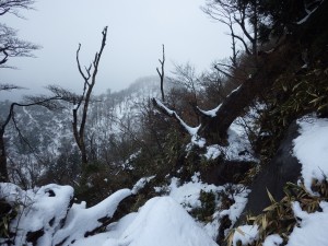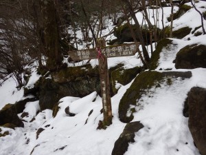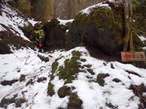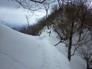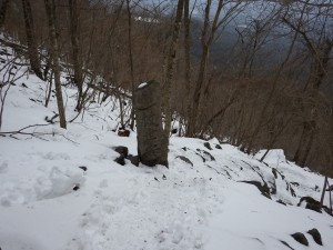 | これが隠れるくらい降雪することもある | この辺りはシオジ林 | 望雲台との分岐(13:23) |