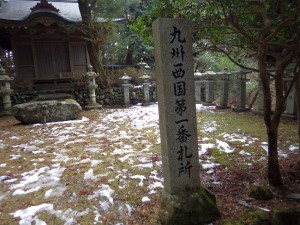 | 道標があるのでその通り進む | 奉幣殿0.9kmとある | 九州二市国第一番札所とある(14:42) |