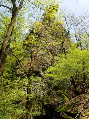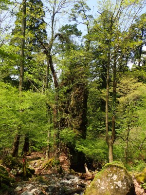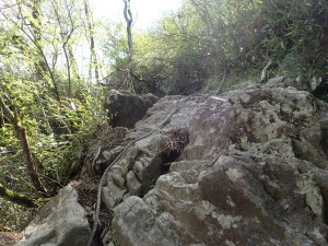 | 前ページからの続き 目印のテープを見つけながらの道は、再び石だらけになるとシャクナゲの群生地となる。 陽当たりの良い場所では既に満開の株もあるようで高揚している自分に気づくが、同行者がいないのでこの歓喜を分かち合えないと言う気持とは裏腹に独り占めできたと言う満足な気持があるのも事実である。 当たり前であるが谷間は徐々に狭くなってくる。斜面の勾配も当然ながらきつくなる。 頭上に上宮が見えてくると斜面は、いよいよきつくなって南岳と中岳の縦走路(正確には巻き道)に飛び出る。 ここからは登山者の賑わうメジャールートである。 上宮がある中岳は多くの人で賑わっているが、どうも知り合いもいないのでその先の岩場で静かなランチタイムを過ごす。ん?と思いきや一羽の小鳥が傍で鳴き続けてくれて結構賑やかだった。 北岳へ進もうとすると今度はご夫婦(ご夫婦に見えたが定かではない)から道を尋ねられた。鬼杉へと行きたかったようだが、中岳から北岳へと反対に進んだようで地図を見ておかしいと気づいたらしい。おかしいのに気づくことは良いことである。気づかずに遭難する人が多いのであるから。 北岳からいつものように高住神社へと降る。既に午後なのに登ってくる登山者が多いのはなぜなのだろうか・・・・・。 整備が進んだ裏彦ルートは、地震の影響もほとんどないようで次回のアタック山の会の山行には問題なさそうである。ただ、シャクナゲの花の見ごろは終わっているかもしれない。 今日も自然に山に感謝!! ■ 豊前坊-(8分)-薬師林道入口-(8分)-登山口-(50分)-ケルンの谷-(40分)-南岳と中岳の縦走路-(6分)-中岳-(25分)-北岳-(55分)-豊前坊 ※休憩時間は含まず。全行程で4時間でした。距離6.16km 標高差478m |