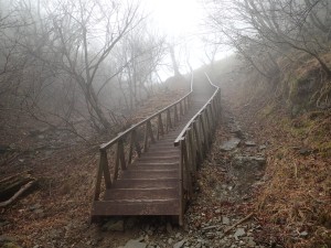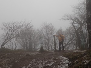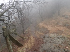 平成29年1月9日(月)成人の日 天気 曇り時々雨 ■出発時間:7時半頃 ■メンバー:単独 1月にしては暖かく天候の良い正月だったが山には行けず、ようやく行ける日が来た。 天候は昨日から思わしくないが、予報では回復に向かっていて「曇りのち晴れ」とある。 期待をして出かけるが、油木ダム辺りから土砂降りになって気持ちも下り坂となり、それが腹立たしさに段々変わってくる。 豊前坊についても雨が降っていてスマホで雨雲レーダを確認するが、既に通り過ぎているようだ。待つこと40分、ようやく止んだようなので出発する。 高住神社で参拝して北岳へと歩く。さすがに登山者は少ない。 北岳だけはガスで覆われ、このまま中岳まで展望もない霞んだ世界を歩く。 中岳に着くとちょうど昼である。小屋には先客が一人いて暖かそうな食事をしていた。 私もサーモスでインスタント味噌汁を作り、今朝握ってきたおにぎりをほおばる。 ちょうど食べ終わったころに3組の登山者がやってきたので席を譲る。どうも天候回復はまだまだのようなので最短で下山できる北西尾根を降ることにした。いずれにしろガスで景色を楽しむことはできそうにない。 北西尾根の岩場には北岳への岩場にも設置された新しい梯子があった。(梯子がない頃は、苦労して上り下りしたのだが・・・・) 散策路の分岐から真っすぐ降らずにスキー場への散策路を歩く。 時間もたっぷりあるのでのんびりと鼻唄でも歌いながら歩くとしよう。でも一人だとどうしても急ぎ足になる。 参道に出ると鹿が跳ねていて心も和む。食害とは言え、憎めない可愛い存在だ。 豊前坊に無事着いたが、青空は広がらない。逆にそれで良かった。今日も自然に山に感謝!! ■コースタイム 豊前坊-(45分)-北岳肩-(22分)-北岳-(25分)-中岳-(50分)-スキー場-(25分)-豊前坊※休憩時間は含まず。全行程で約3時間10分でした。 |