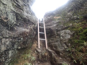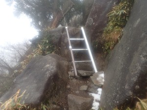 | 岩のテラスからも展望なし | 梯子がF設置されている | 中岳頂上は近い |