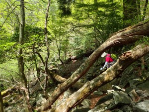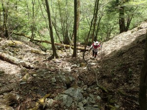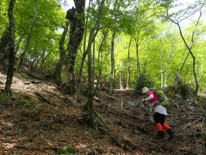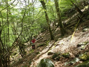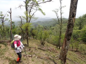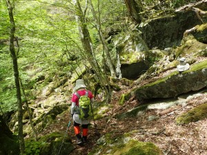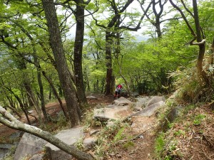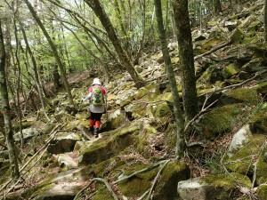 | 苔むした岩が多い | 尾根と谷を7いくつか横断して行く | ここから降る |