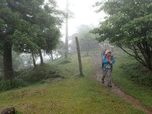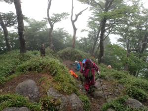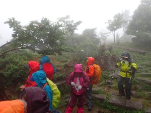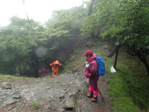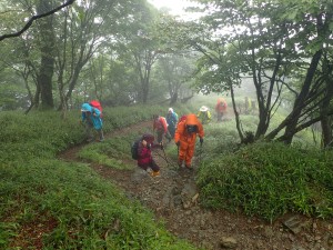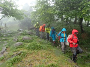 平成29年6月25日(日)天気 雨 ■出発時間:7時 (北九州市小倉南区下曽根付近) ■メンバー:男性4名、女性6名 計10名 雨でも決行するのが、当山の会である。 よほどのことがない限り中止しないのが、当たり前となっている。 と言うか、中止となると結構面倒だからかもしれない。 そんな雨模様なので歩き慣れた英彦山ではあるが、雨ともなればルートはできるだけ安全でなるべく短時間のコースとなる。 予定では、別所駐車場から豊前坊まで歩き、北岳、中岳を経て表参道を降る周回コースだったが、雨は、止みそうにないので豊前坊から北岳、中岳を経て表参道を途中からバードラインへ、散策路の途中からキャンプ場へと尾根を降る。車は1台、事前にデポしておくことで別所から豊前坊までの歩きを省略した。 お目当てのオオヤマレンゲは、北岳肩の手前は、ほぼ終わりで表参道は、未だ蕾がたくさん残っていた。標高や陽当たりから言うと逆のように感じるが、やはり植物にも個性があるのではないか。 北岳の頂上に立つと雨はあがったように感じたが、中岳から下山する頃にまたシトシトと降ってきた。 表参道からバードラインに入り、山腹を巻き、北西尾根との合流点より尾根をキャンプ場に降るとゴールである。短いコースであったが、ま、オオヤマレンゲの花が見れて良しとしよう。帰路に道の駅「勧遊舎ひこさん」に立ち寄るが、雨雲は山にかかっているだけで下界は完全に止んでいた。梅雨はこんなもんである。 今日も山に自然に仲間に感謝!! ■コースタイム 豊前坊-(50分)-北岳肩-(20分)-北岳-(35分)-中岳-(30分)-バードライン分岐-(35分)-観察路分岐-(17分)-キャンプ場P ※全行程で約4.5時間、距離6.24km、標高差463m |
