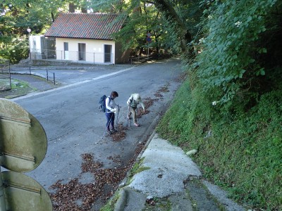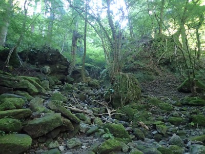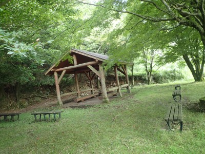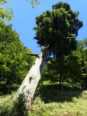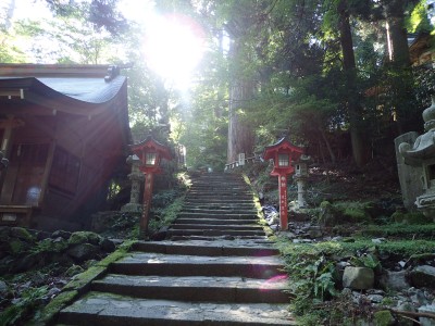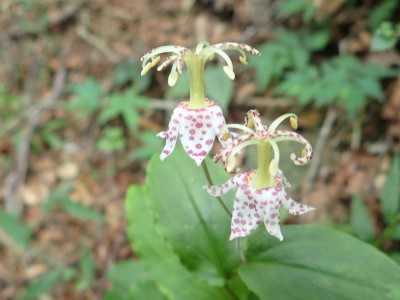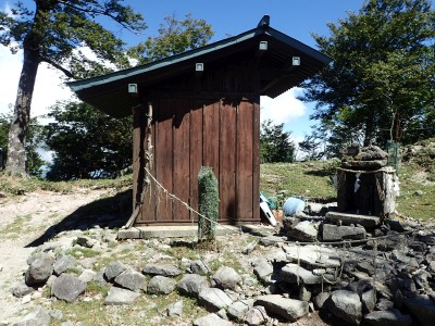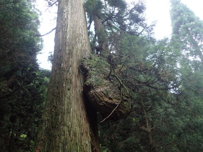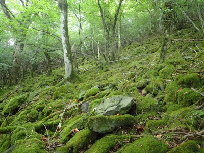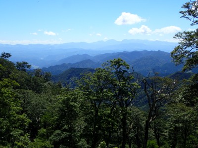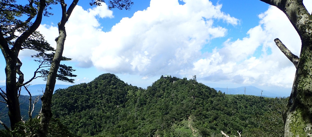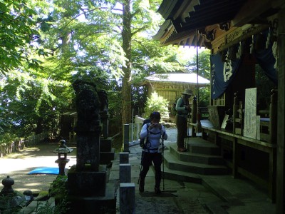 下山は、参道を降り途中からバードラインへ。青かった空が白くなってきた。山腹を巻きながら降り、スキー場に飛び出る。東屋で休憩しているとポツポツと小さな雨粒。まあ、森の中を歩くのでこれぐらいはいいやと豊前坊へと歩を進める