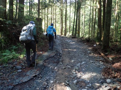 P-(15分)-玉屋神社参道入口-(30分)-玉屋神社-(60分)-鬼杉-(12分)-裏彦ルート入口-(30分)-籠水峠-(25分)-猫の丸尾-(25分)-最低鞍部-(30分)-大南林道-(45分)-P ※全行程で