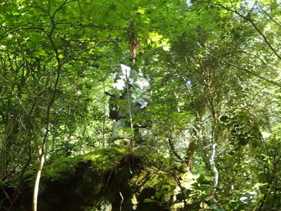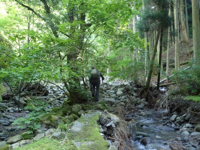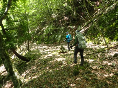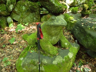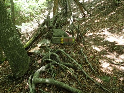 さて、今日も福太郎さんの近くの駐車場に停めて林道を歩く、玉屋神社へ参道は鳥居があるのでわかりやすい。この道はかなり前に一度通ったことがあるが、ずいぶんと荒れた気がする。途中道がなくなり、コンクリート道の残骸を目にして大きな石の蛙を見ると上部に烏天狗のような石像が見える、帰宅して調べると猿田彦大神のようだ。木が多い茂っていてここで立ち止まりゃなきゃ見逃すところである。玉屋神社からは、前回と同じルートで鬼杉へ。そして裏彦ルートに入り込む。入口には道標がなくなっていたが、地図をみればわかる。籠水峠に出ると視界が開け、断崖絶壁は鹿の角の下部である。ここから尾根を歩いて行き止まったピークが猫の丸尾だ。「行き止まり」と表現したのは、真っ直ぐに歩いてきた尾根がここで90度東に折れるからだ。目の前には岳滅鬼が見えるが、繋がる尾根を辿ると確かにそうなっている。頂上から一旦降り、登り返す。ちょうど双耳峰のようにピークがある。ここから直角に南に折れて降る。降りきると「最低鞍部」と小さな道標を見る。今回はここから下山する。緩やかな谷間を降り荒れた林道を抜けると大南林道に出る。この歩き慣れた道をたわいもない話をしながら無事駐車場に着く。今日も自然に山に仲間に感謝!!