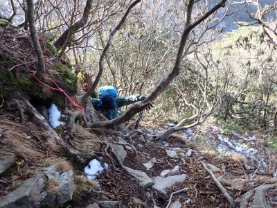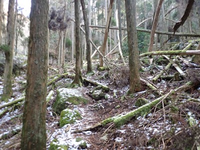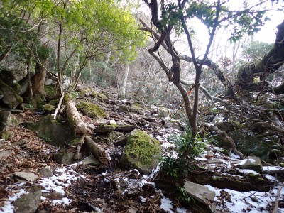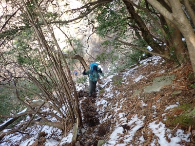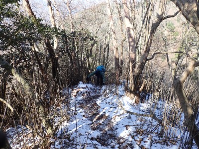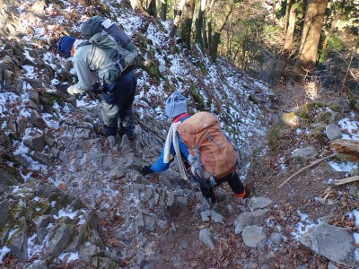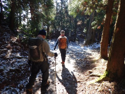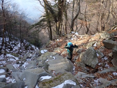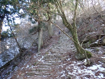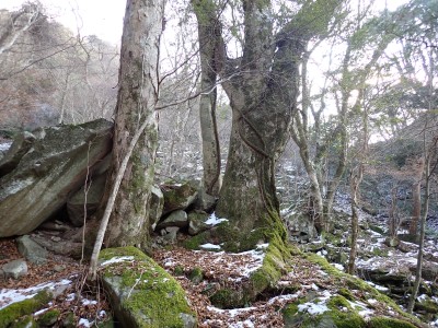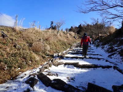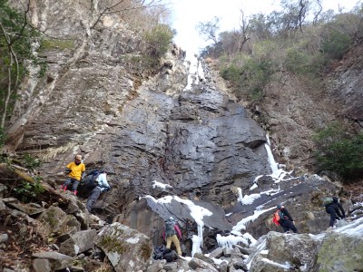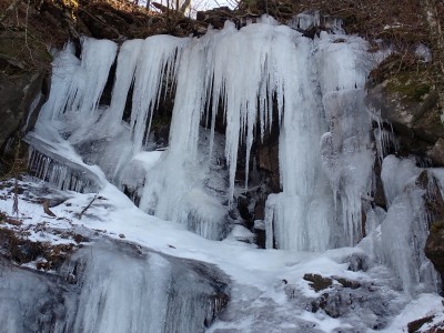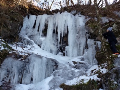 今年の初歩きは、やっぱり英彦山。年末から久しぶりに家族が集まり、昨日まで嵐のような日々であったが、夕方には日頃の静けさを取り戻した。ホッとする反面、少々寂しさを感じる。新年の初歩きは、毎年カミさんと歩くのだが、家の片付け等もあり今回はヨッシーを誘い付き合ってもらうことにした。気温は1℃、雪はなく別所駐車場につくと既に満車に近い状態。ここにこの時間に停めるのはほぼ登山者だ。準備をして出発。参道を進み奉弊殿でお参りをする。今日はこのところの冷え込みを期待して久しぶりに四王寺の滝を見に行く。10年前は未だこの滝は「幻の滝」と呼ばれていたが、もう幻ではなくなった。鬼杉方面へと進み衣ケ池の横から谷を詰める。途中で左に滝が見えたので赤テープの通り登り詰めると足下は浮き石だらけで落石しそうになるが、がんばって進むとどうもおかしい。ほとんど氷結もないし・・・・すぐに間違いだと気づき、私たちの方向に来る後続者に「こっちじゃないですよ」と声をかけ、用心して正しいルートへ引き返す。テープを信じるとこんなことになるので注意だ。地図を見ると谷が分かれて方向的には真っ直ぐに行けば良いのに左に折れてしまった。四王寺の滝が見えてくると大勢の人の声も耳に入る。しかし、残念ながら凍った氷柱は、ほぼ落ちていてあの迫力のある氷瀑を拝むことはできなかった。「また次回に」と話しながら滝から右に南岳を目指す。もちろん整備された登山道ではない。とても急峻で少々危険である。南岳へやっとの思いで到着し、中岳へ。予定では北岳経由で豊前坊に下山する予定であったが、思ったより疲れたので中岳から参道を下山することにしてとりあえず中岳で昼食をと避難小屋に入ろうとすると山友のご夫妻が食事中であった。話の中でWの滝は氷結していると聞き、ご一緒させていただくことに。そして半ば諦めていた滝は見事に氷結していた。同行してもらったヨッシーも喜んでもらえたのではないかと思う。帰りに道の駅英彦山に立ち寄るが、野菜も惣菜や弁当もなく人だけがうろうろしていた。今日も山に自然に仲間に感謝!!