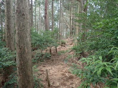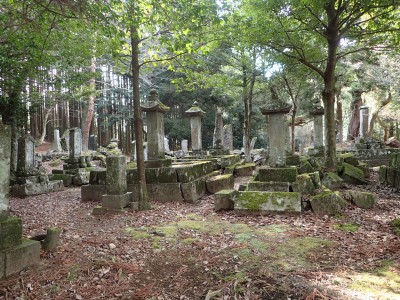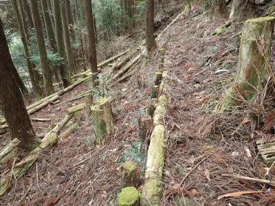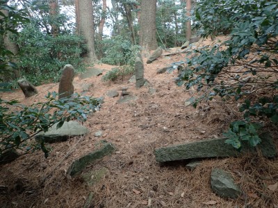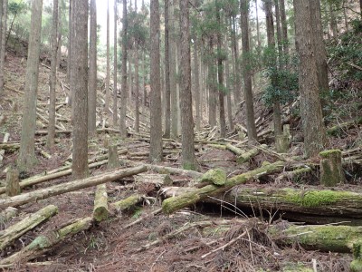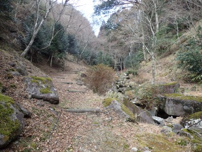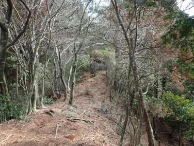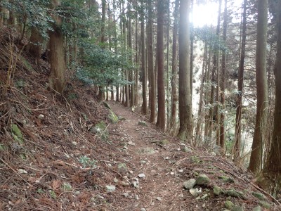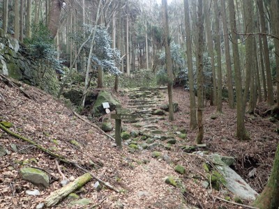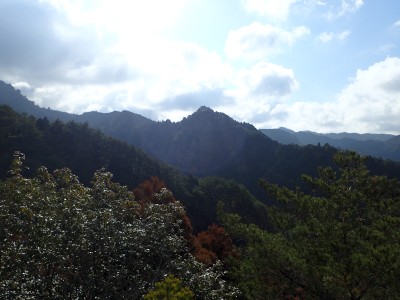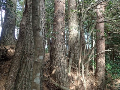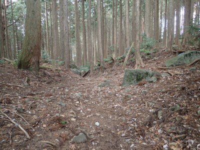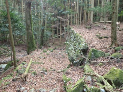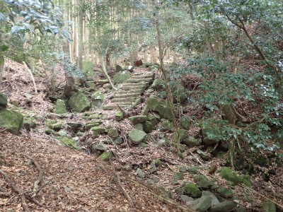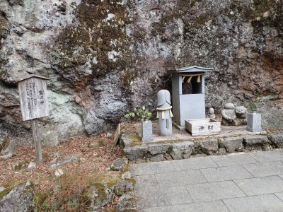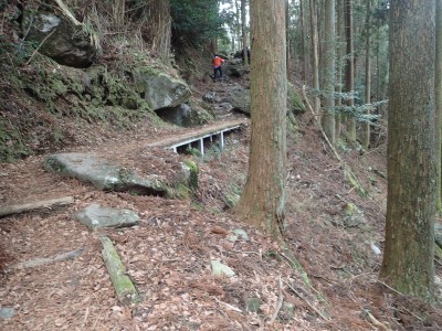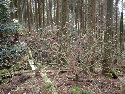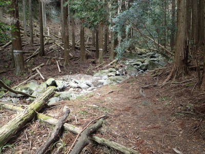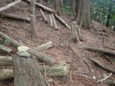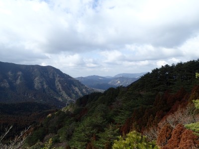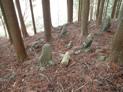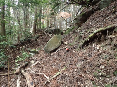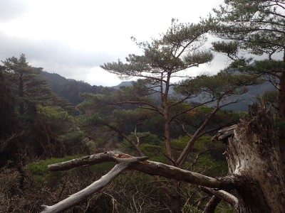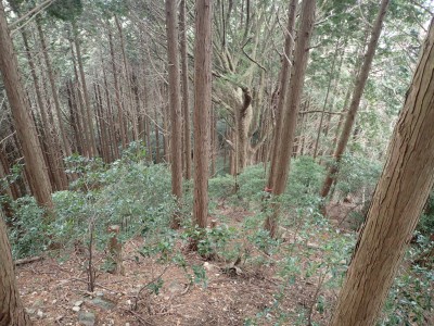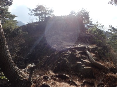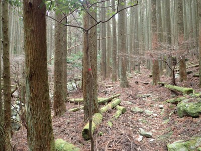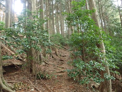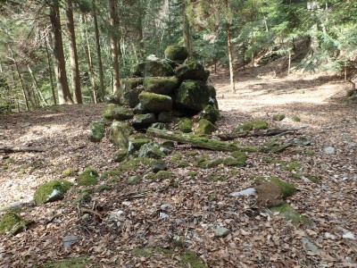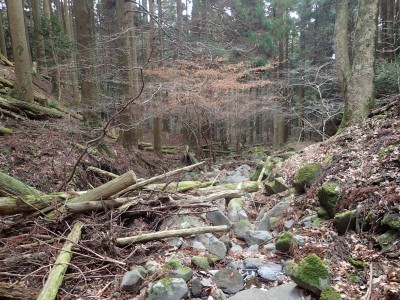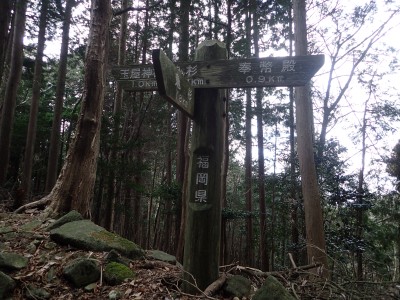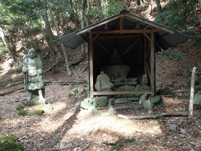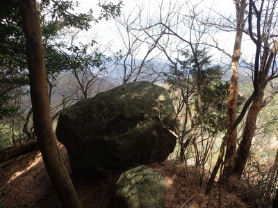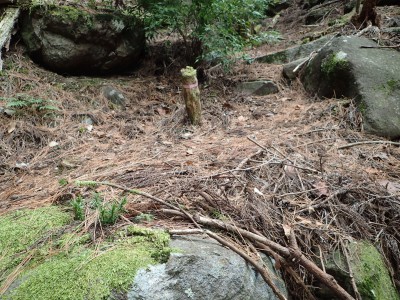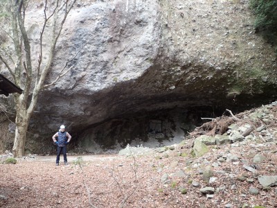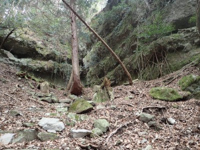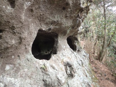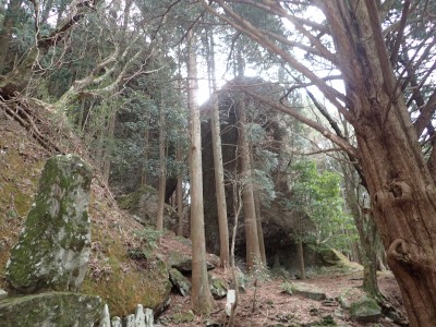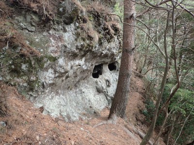 ただ単に双戸窟だけを見に行くだけなら奉弊殿から登山道を歩いた方が良いのだろうが、今回は英彦山大権現下の登山用駐車場からスタートし、英彦山大権現へと戻る周回コースを歩いてみることにした。取り壊されたシャクナゲ荘跡より英彦山大権現へ向かい、右手にある登山者用駐車場があるので車を停める。ちょうど福田太郎英彦山工場の入口である。工場下の駐車場の脇にコンクリートの歩道があるのでここより入る。コンクリートの道がなくなると踏み跡と赤テープを辿るが、踏み跡も赤テープもあまり頼りにはならない。GPSで自分の位置を確認しながら地図で自分なりにルートを見極めながら進む。谷を詰め山腹に上がると道は明瞭で小さなケルンより尾根に取付くと左手には古い墓石が点在している。痩せ尾根になると目印の巨石が見えて右にちょっと降ると写真で何度も見たドクロが姿を現した。これはもう面白いの一言だ。本当にドクロだ。近くで人の声がするが進方向に遠ざかってゆく。双戸窟から露岩帯を抜けると先ほどの声の主たちであろうグループに追いついた。ちょうど広い墓地で夜には来たくない場所だ。ここから少し登ると登山道にぶつかる。今回は未だ時間が早いので久しぶりに虚空蔵に立ち寄り、再び登山道に戻って玉屋神社方面へと歩を進める。さすがに登山道には歩いている方が多い。鬼杉と玉屋神社経由鬼杉への道標を見て玉屋神社方面へと直進。一旦降って登り詰めた峠より登山道を外れ、西に伸びる尾根を進むと白岳と書かれた古い板があった。この尾根の先っぽには大きな石がある。魅力的な石だが名前は付いていないようだ。尾根は左へと急降下して平坦な場所に出る。おそらくここから下は坊跡であろう。とにかく英彦山大権現へと方向を定め、歩きやすい場所を降ると建造物が見えた。左を見ると石段がある。巨木の間を抜け建造物に近づくとそこには弘法大師像と小さなお社がある。以前は玉屋神社への道があったはずだ。地図では旧道と思われる破線があって石段を行けば登山道に出るはずである。ここで腹ごしらえをして地図上の破線を辿ってみることにしたが道はよくわからない。しばらく行くと石垣が続きその脇に道らしき跡を歩きミツマタの群落を見て南に向けて進むとまたしても墓石が点在し、建造物が見えてくるとそこが英彦山大権現の敷地だ。降りやすい場所を選んで敷地内に出た。お参りして無事駐車場に戻る。初めてのルートはやっぱりワクワクして面白い。それに今回は英彦山には墓石が多く点在していることがよくわかった。