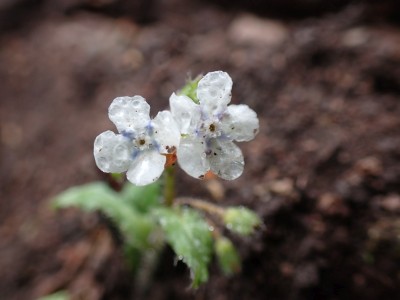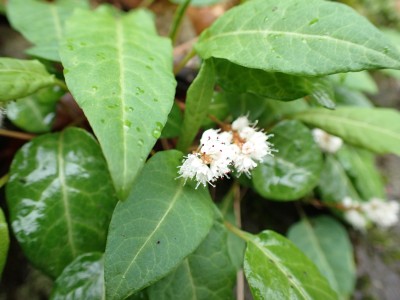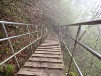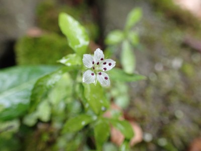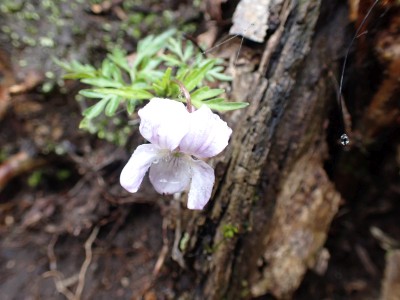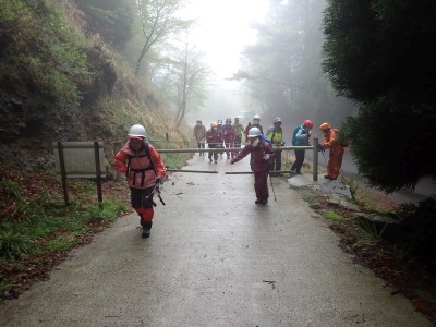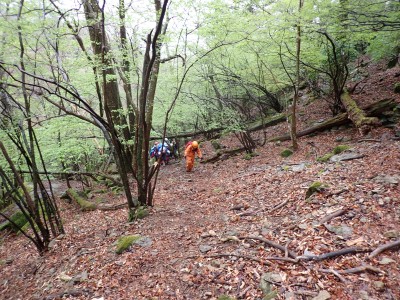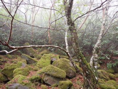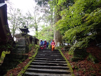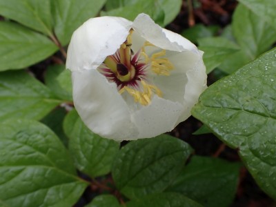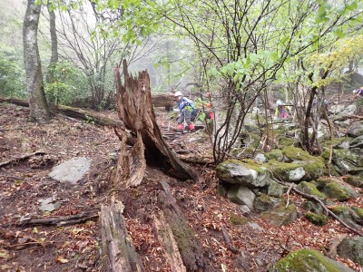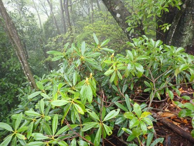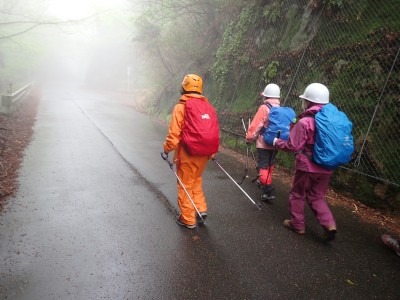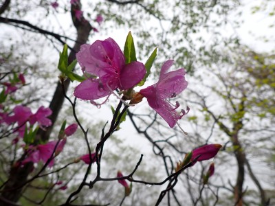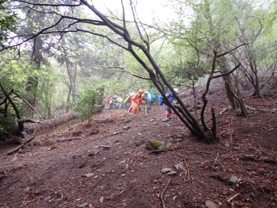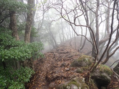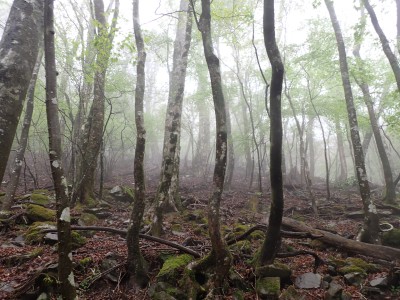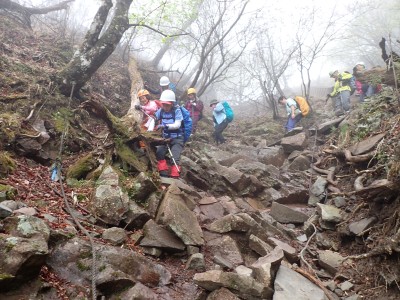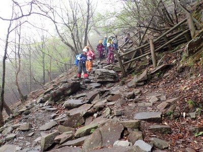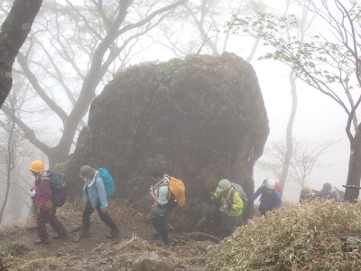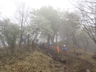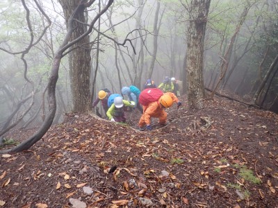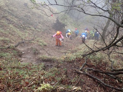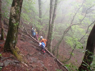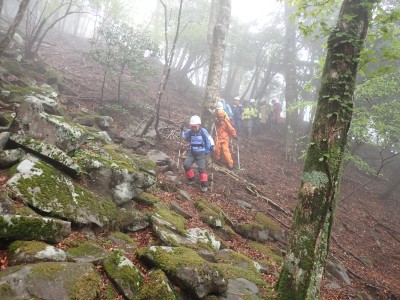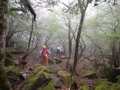 集合場所より3台の車に相乗りして出発。途中、道の駅でトイレ休憩して豊前坊へ。霧が濃いが雨は降っていない。降っていないが、雨具を着て登山開始。薬師峠を過ぎ、裏彦ルートの登山口に入る。杉林を抜け急斜面を進んで断崖絶壁の尾根に取付き山腹の長い道程となる。道は昨日からの雨でぬかるんでズルズルと滑る。ヤマシャクヤクの群生地に着くと花は残念ながら閉じていた。雨のせいだろう。その中に1輪だけ開いているのを見つけてモデルになってもらう。メンバーは皆踏まないように慎重にカメラのレンズを花に向けていた。撮影会が終わり再び歩き始める。ケルンの谷への降りは晴れているときと違ってかなり手こずった、いや「足ずった」だ。ケルンの谷で十分休憩して今度は急斜面を登り返す。谷を詰めてきれいな林に出るとそこからはシャクナゲの大群落だが、こちらも花芽がない。あっても未だ堅い蕾だ。谷を詰め終わるとそこは中岳と南岳の縦走路に出る。気持ちはとても楽になる。中岳についてランチタイム。さすがに今日は登山者は少ない。記念写真を撮って下山は北岳経由で豊前坊へと降る。こちらのルートも石が濡れていると滑りやすく、予想以上に時間と体力を要した。
