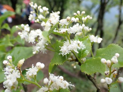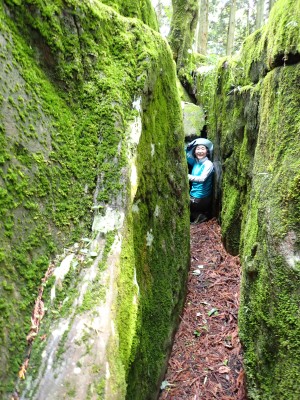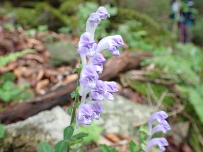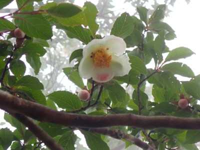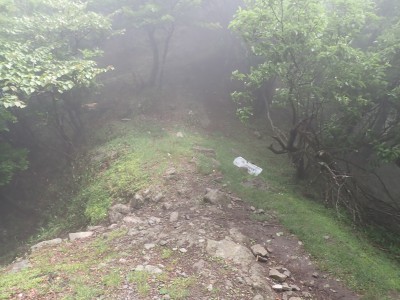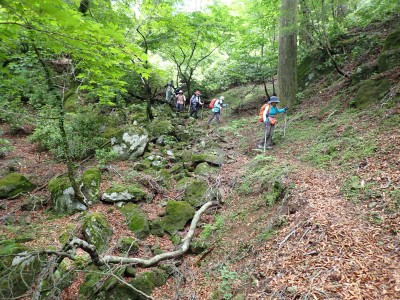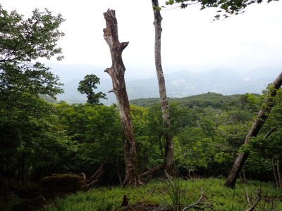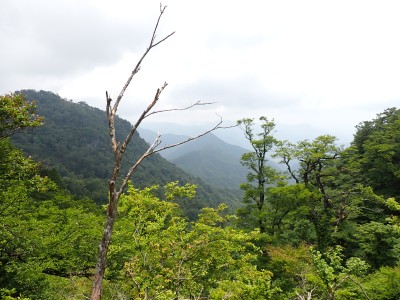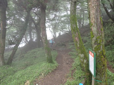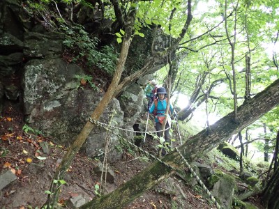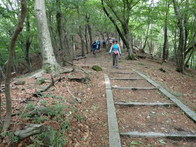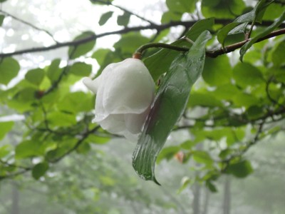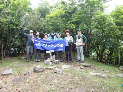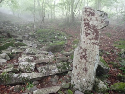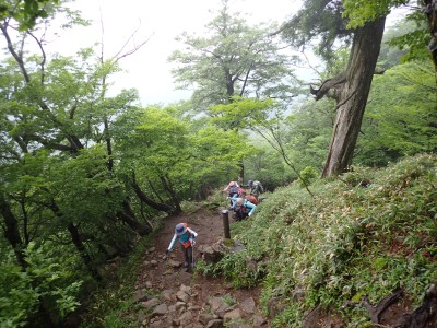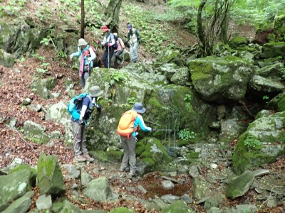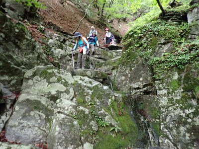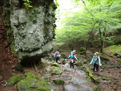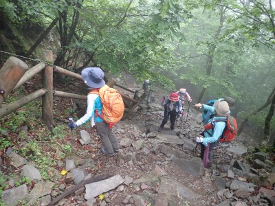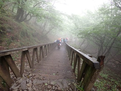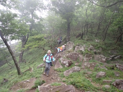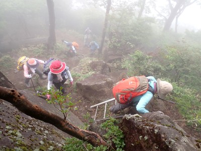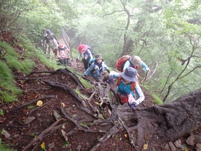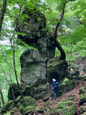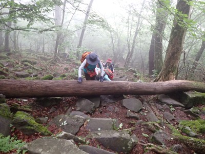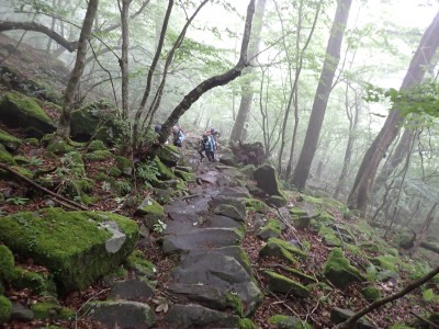 豊前坊に着くと少々肌寒い。霧がかかっていて陽射しはない。この霧はなかなか抜けることはなかった。高住神社でお参りして出発。ゆっくりのんびりと歩く。登山者はとても多く追い越しを何度かしてもらう。期待のオオヤマレンゲは残念ながらちゃんと開いた花はなく蕾がひとつしかなかった。北岳の肩から難所をクリアして北岳へ。ここで1回目の記念写真。そして中岳への快適な道もガスで視界は効かず、岩場を登って中岳に着く。中岳ではヒコサンヒメシャラを見に立ち寄ると撮影会が始まる。薄っすらと赤みを帯びた花びらが何とも愛らしい。そして南岳へ、参道に出て一旦降り、そして上り返すと頂上だ。ここで2回目の記念写真。腹時計が既に昼を指しているので上宮の朽ちかけた神殿を見ながら中岳へと戻りランチタイム。このころにはようやくガスが抜けて青空が見えてきた。本日3回目の集合写真を撮り、北西尾根を降る。広い尾根は、笹原に白骨化した巨木が突き出ていて見事な景観である。振り返れば北岳と南岳の稜線が意外と急勾配で繋がっているように見える。展望がとてもよく美しい尾根道だ。それもすぐに終わり、森の中に入ると急勾配が待っている。岩は板状の石が重なっていた崩れやすい。尾根はやや細くなり平坦になると谷へと道なき道を降る。谷へと降りきると今日のお目当てである巨石を目にする。皆それを見て驚く。これほど巨大だとは思ってなかったらしい。私がモデルになって写真を撮ってもらう。いかに巨大かわかるだろう。さてここからしばらく涸れ沢を歩く、わずかに水が流れている場所もある。観察路に出合うとキャンプ場に出て途中で針の耳で遊び、無事豊前坊に着く。針の耳では、Nさんが通過した。心の清い人のみ通過できるそうだ。今日も山に自然に仲間に感謝!!