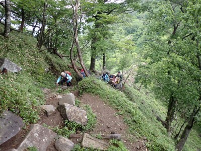 英彦山の上宮社殿修復整備工事が来月から始まる予定である。工期は4年間、その間、当然ながら登山規制がある。もちろん中岳は登頂できないし、北西尾根は資材運搬用のモノレールが設置されると聞いた。これは私にとっては一大事である。私の住んでいる北九州市では福智山、足立山、皿倉山など登山口に1時間以内で行ける山があるが、それでも英彦山を歩いた回数が圧倒的に多い。それは英彦山周辺を含め魅力あふれるルートがたくさんあるからである。地形的にも季節的にも変化に富んだルートが数多くあるからだ。北岳へのシオジ林、北岳から中岳へのブナ林は新緑が美しく、裏彦ルートは紅葉が素晴らしく、ヤマシャクヤクやシャクナゲの群落、オオヤマレンゲ、ヒコサンヒメシャラ、イワタバコなどの花々も見れる。また冬は結構な積雪といくつもの氷結した滝。材木岩や巨石、露岩帯の尾根、奇怪な形をした窟と・・切りが無いくらい見所がある。もちろん自然だけでなく人工物も歴史的な遺産もたくさん存在する。そんな魅力ある山が4年間も制限されるわけである。近くの公園がなくなって遊び場が無くなって泣きそうな子供と同じである。そんな思いを山の会のメンバーもきっと持っているだろうと余計なお世話かもしれないが、今月2回に分けて参加者を募ったところ本日は7名の参加者となった。梅雨の時期、雨が心配であったが、幸いにも予報は「晴れ時々曇り」である。