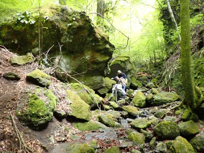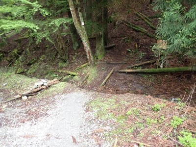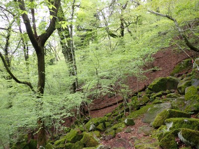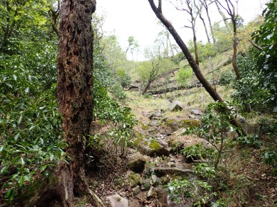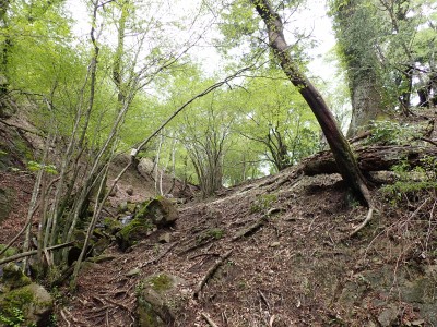 豊前坊駐車場に車を停め、薬師峠へと車道を歩く。目の前には絶壁を有す鷹ノ巣山。薬師林道から裏彦ルートへと入り込む。もう何度も歩いた道だが、ここも正規登山道ではない。ケルンの谷までは山腹を歩く。新緑がきれいで苔の岩とでまさに緑の世界である。そんな気の緩みか、岩で滑って転び、岩と岩の間に腰をくの字にして入ってしまい動けなくなった。痛みは右膝、ケルンの谷まで数メートルの場所なのでしばらく休むことに。ファーストエイドバッグから消毒液と傷パッドで処置して他に外傷はないようなのでほっとする。ただ、腰にきたようで痛みを抱えたまま、山行を続けることになる。