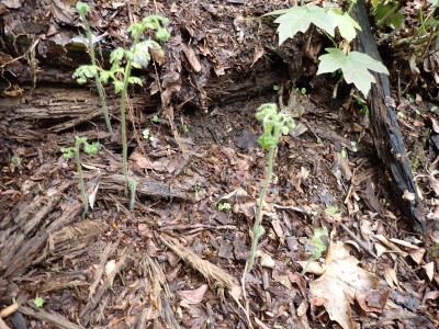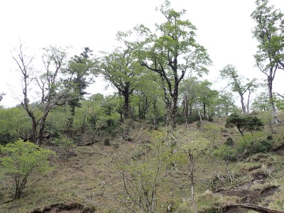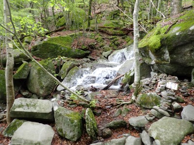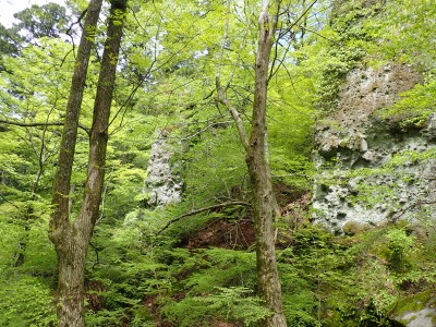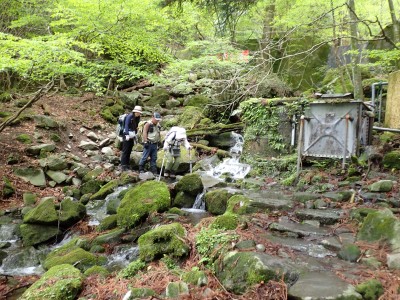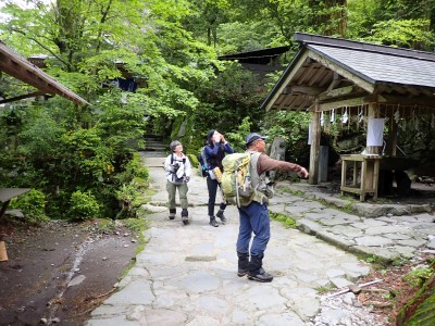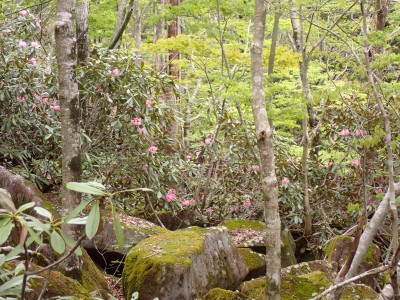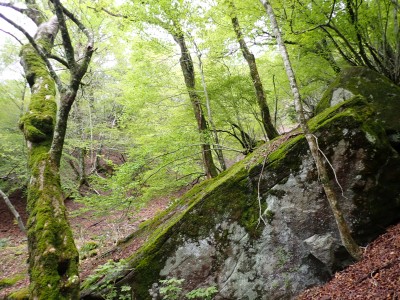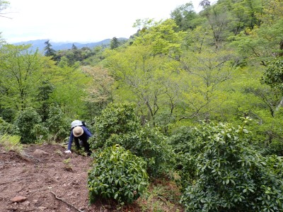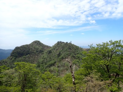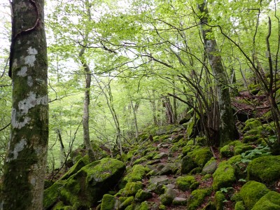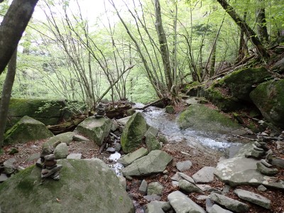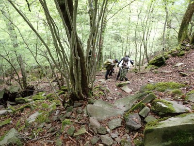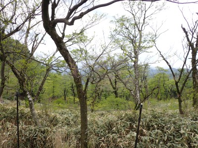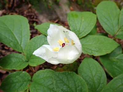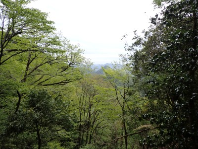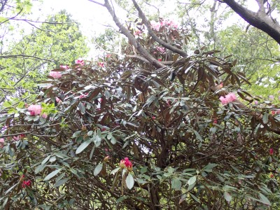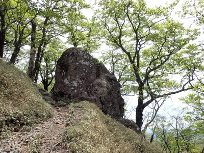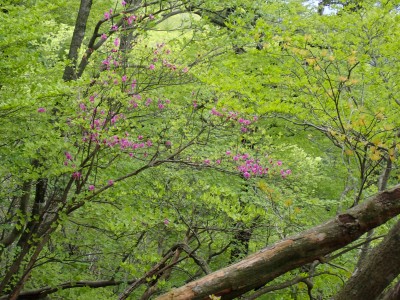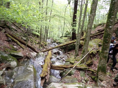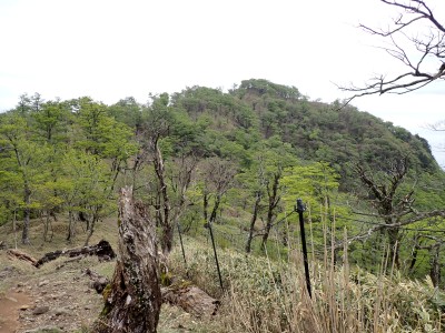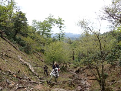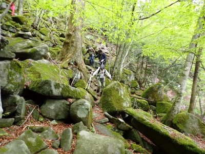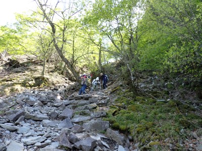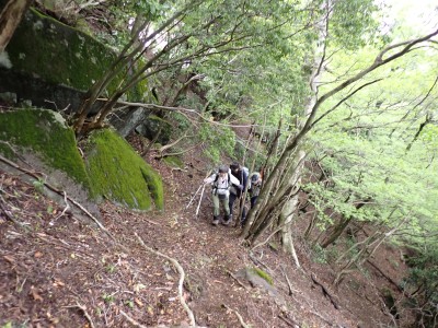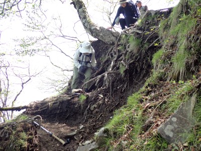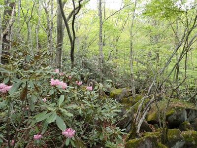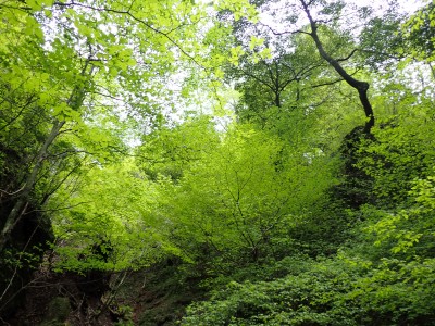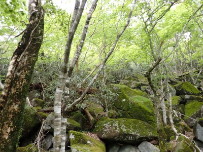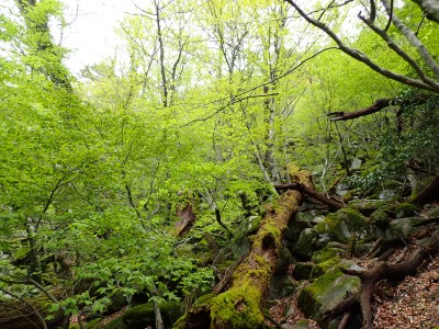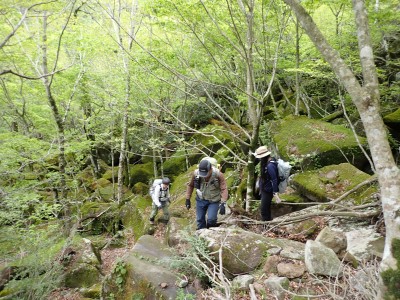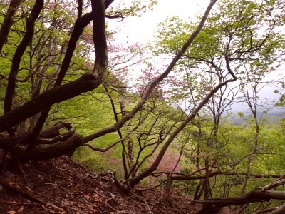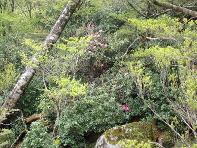 ケルンの谷から南岳の直下まで来ると右へと回り込み、いつもより水量の多い沢を詰める。そして登り切ると広くてなだらかな場所に出る。今では踏み跡もしっかりして辿れば南岳と中岳の縦走路に出合うが、今回はここからサバイバルだ。苔むした大きな岩を乗り越えて高度をあげる。そうここがシャクナゲの多い場所で道はない。しばらく格闘したが、岩場を横断して谷の際まで進み、斜面を詰めて行く、以前は、踏み跡が無かったがしっかりとあるのでここも多くの人が歩いているのだろう。縦走路に出るときれいなブナ林に見とれる。北岳までのんびりと歩く、途中寄り道をして北岳頂上の南側でランチタイム。白一面だった空は青い部分が広がってきて遠望も楽しめる。ランチタイムを終え、豊前坊へ下山。女子高校生の集団が、登ってきている。皆元気だ。新緑に包まれ無事下山。高住神社ではFさんがしきりにトチノキの説明を参拝者にしていた。よく見ると実がなっていた。トチノキに実がなるには30年かかるらしい。今日は転けてしまったが、ヤマシャクヤクもシャクナゲも見れて楽しいメンバーと歩けて満足の1日であった。今日も山に自然に仲間に感謝!! |