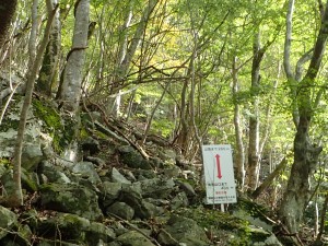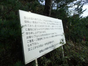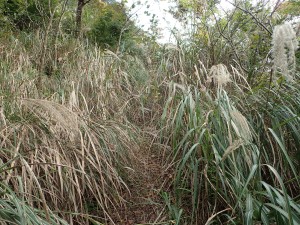 | カヤを掻き分けて進む | 登山者への案内板 | 色づいている |
