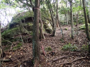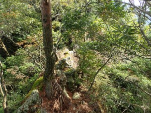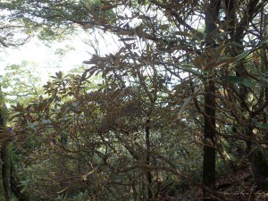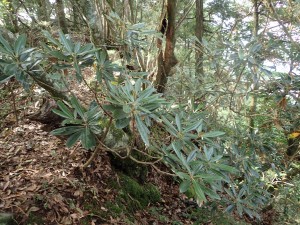 | 露岩のヤセ尾根はスリリングだ | 奇木もある | シャクナゲの群落 |