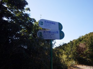 | 神社の広い駐車場(10:18) | 駐車場から見上げた | 出発!道標がある(10:34) |