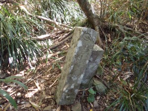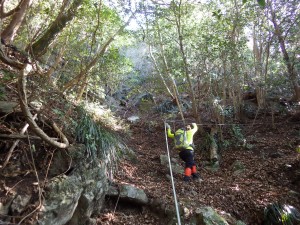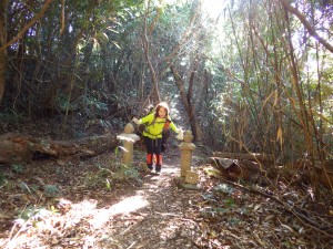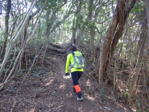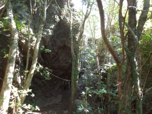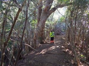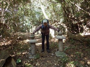 | 門柱のようだ(10:39) | 自然林の中を進む | ヤセ尾根には巨木がある |