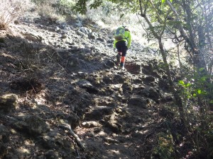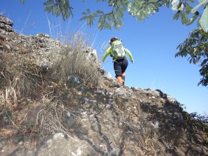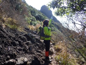 | 急斜面を登る | 下から上を見る | 岩尾根に出た |