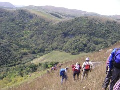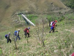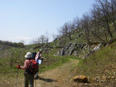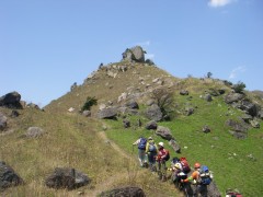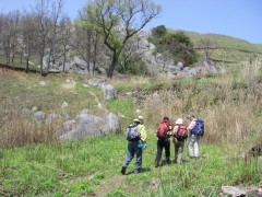 2010年4月29日(木)祝日 天気晴れ 自然観察とボランティアの山の会のでは、毎年恒例の清掃登山と自然観察会をしている。今日は本番に向け、下見と言うことで集まった。 コースは色々とあるが今日は一通り歩こうと言うことで車道沿いを除き、主なコースを歩いた。 前回遊山歩で歩いたコースと似ているが、千貫岩へ行く途中で洞窟があることを知り(入口には粗大ごみが捨てられていた)、行橋方面への道から天狗岩に上り、貝殻山から目白洞へと歩いたのは今回初めての体験である。平尾台は本当に奥が深い。 |
