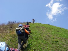 | 斜面を滑らないように | 見上げると岩が | 貝殻山 |
