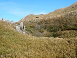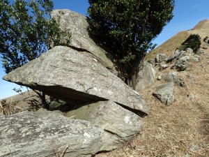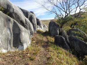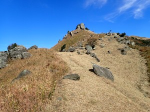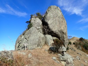 | 貝殻山の頂上は行かず反対側に降る | 面白い岩が見える | 野焼きした脇の登山道を行く(10:01) |