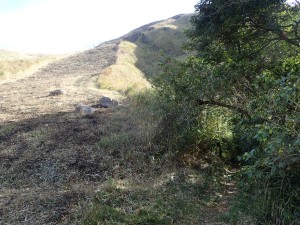 | 山腹を南に歩く | 小さな沢がある | 振り返ると貝殻山の頂上部が見える |