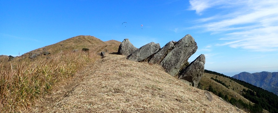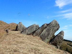 | ▲平尾台は日本のパラグライダー発祥の地と言われている。(天狗岩から桶ケ辻への稜線にて) | ||