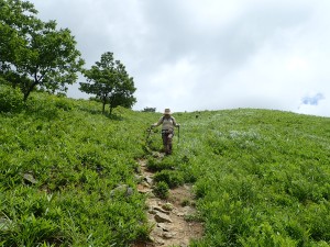 | 肩でランチタイム | 急斜面を慎重に降る | オカトラノオが咲き乱れる |