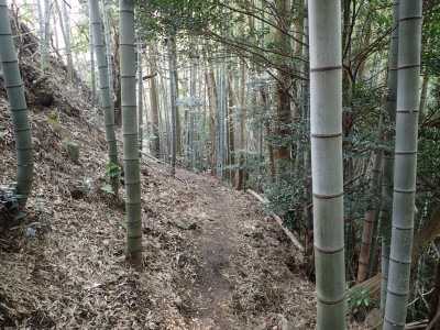 | 貝殻山を反対側へ降る | 左に目をやると尖った岩が見える | 杉林から竹林を抜ける |