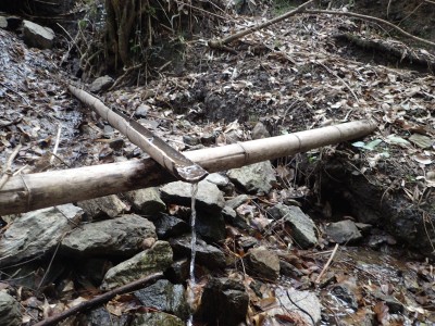 | 水場 | 白い四角に見えるのが千仏ロック | 山腹を気持ちよく歩く |