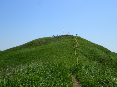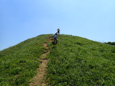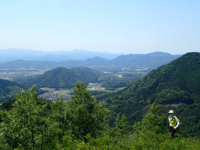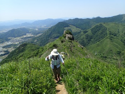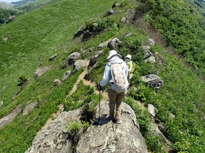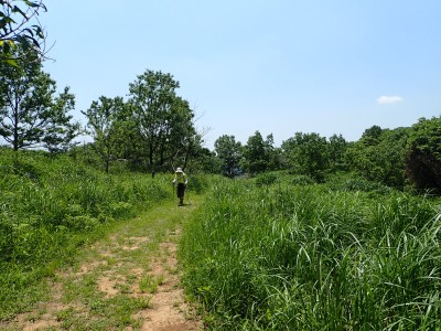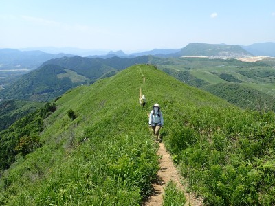 午前8時30分、観察センター駐車場は予想通り空いている。天気も良さそうだ。車道からそば畑を右折し、農道に入る。砂利道が終わると左に不動山を目指す。ここから登山道が始まる。稜線に立つと桶ヶ辻の稜線を目の前にする。これから歩くルートがくっきりと見える。娘にあそこを歩くんだとルートを指でなぞる。千仏鍾乳洞の入口に出て貝殻山を登る。結構きつい登りだ。頂上には立ち寄らず降竹林に入る。あふれる水で心が癒やされる。竹林は今が一番きれいなのかもしれないと妻と話しながら竹林を抜ける強い日差しの中、今度は桶ヶ辻の麓を稜線と並行して歩く。この辺りで3組の登山者とすれ違う。折り返す地点から展望が開け田畑を見下ろせる。そしてここから桶ケ辻まできつい稜線歩きが始まる。天狗岩まで来ると遅い朝食をここでとる。眺めがとても良く上空にはパラグライダーが飛んでいる。きつい登りをクリアすると桶ヶ辻の頂上。大勢の人で賑わっていてパラグライダーの聖地と言われる場所だ。飛び立つライダーをうらやましく見て桶ヶ辻の頂上からすぐの西へ延びる支尾根を降る。目の前には先ほど登った貝殻山が見える。降りきると湿原帯に出て北から西へと回り込む道が続く。目白洞に出ると茶ヶ床園地から繋がる車の列を目にする。やはり超満車状態だろう。茶ヶ床園地から遊歩道を経て観察センターに無事下山。短いコースだったが、妻と娘にとっては十分な距離と時間であったろう。今日も自然に山に感謝!!