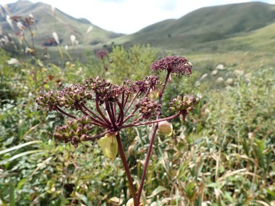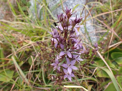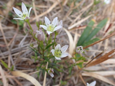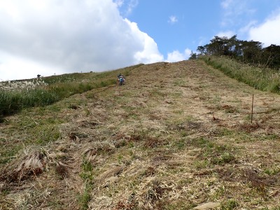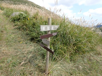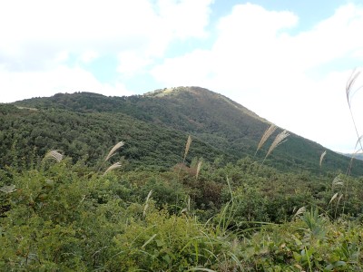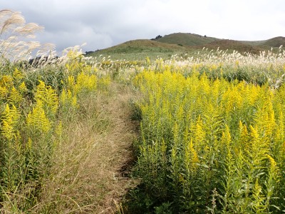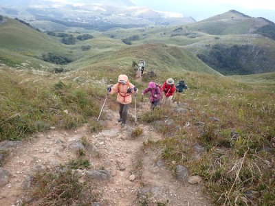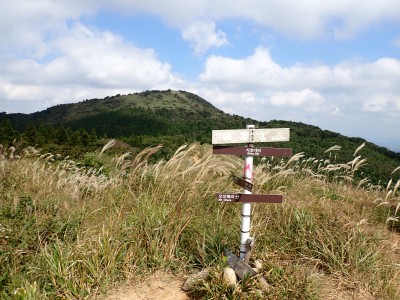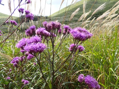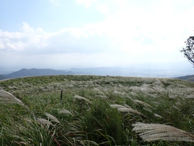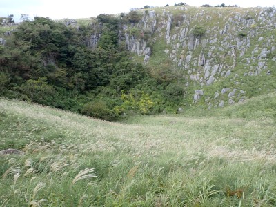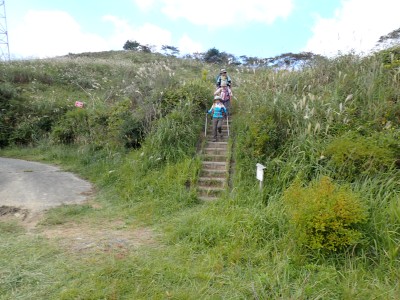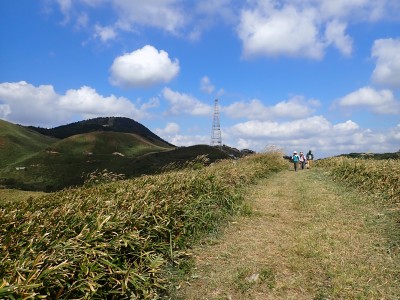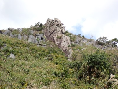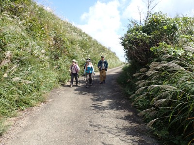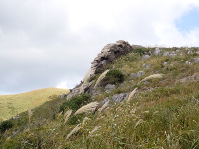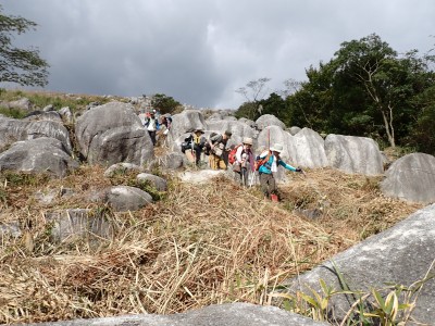参加者は私除いて4名。吹上峠から少々きつい登りも会話が弾み、きつさを感じず登り切る。大平山では駐車場で偶然お会いした宮ちゃんさんや山帽子さんが休憩していて写真を撮ってもらう。貫山を見ながら花を見ながら進む。中峠からの稜線に出るが、雨雲が現れて強風となったので雨具を着る。四方台へ来ると風も弱まり陽射しが強くなった。もう雨具は不要だ。貫山には登らず、水晶山方面へと広谷台を目指す。ススキの穂がなびく草原はとても気持ちの良い道だ。鬼の唐手岩でランチタイム。岩に立って子どもみたいに喜ぶメンバーを見ているととても幸せな気分になる。本日予定外だったが、青龍窟に行きたいと言うので立ち寄ることにした。青龍窟は洞内からナウマンゾウなどの多くの化石が発見されていると話すと初めての人は驚く。往路を戻り、滝不動を見て広谷湿原から茶ヶ床園地へ。トイレを済ませのんびりと農道を吹上峠まで歩く。スマホの万歩計は18600歩、結構歩いた。天候にも恵まれて秋の平尾台を満喫できたのではないかと思うが・・・・。自己満足なのはわかっているが、付き合ってくれた仲間に感謝だ。
