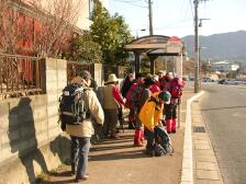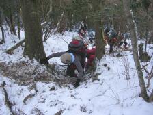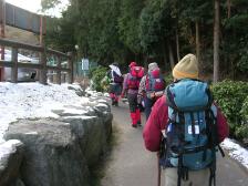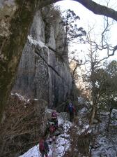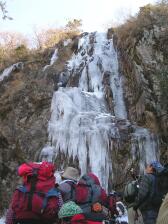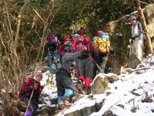 2006年2月5日 天気 晴れ 今日は「足立山のYさん」のお誘いで難所ケ滝の見物を兼ね、宝満山へ行くことになった。集合はAM7時小倉駅、私たち夫婦にとっては始めての公共機関を使っての山行だ。 午前5時に起床し、愛犬レオの散歩を済ませ自宅前のバス停より出発。JRに乗り換え集合場所であるJR小倉駅に向う。ホームを降りるとすぐに前回足立山でご一緒させていただいたTさんから声をかけられた。どうも同じで電車だったようだ。集合場所でYさんの簡単な説明と竹細工のようなものを渡された。朝食を満足に食べなかったのでホームの売店でパンを買い、電車の中で食べることにした。簡単な自己紹介を済ませ総勢11名での旅となった。どんな旅になるのかとても楽しみだ。 <今回のコース概略> JR小倉駅→(鹿児島本線)→香椎→(JR香椎線)→JR宇美駅→徒歩→上宇美入り口バス停→(西鉄バス)→下障子岳バス停下車→昭和の森→登山口→難所ケ滝→仏頂山→宝満山→羅漢道めぐり→竃門神社→(西鉄バス)→内山バス停→西鉄太宰府駅→西鉄電車→西鉄二日市(乗り換え)→西鉄天神駅→高速バス→行橋方面行き→自宅 今回は羅漢道めぐりをしました。途中に遠望岩や石仏などがあり見所があります。ただ地図上はちょっとした回り道のように錯覚しますが、かなり降下し再び山頂直下まで戻ることになります。行程としては約60分かかりますので時間に余裕をもった計画が必要です。 <今回のコース詳細> 下障子岳バス停より昭和の森を抜け、登山口より河原谷コースで難所ケ滝を目指します。途中アイゼンを装備し、上りを進むと仏頂山との分岐があります。さらに急登を進むと滝が見えてきます。昭和の森から約80分で難所ケ滝に到着です。滝の見物が終わったら一旦元の道を戻り仏頂山へのコースへ進みます。雪の中、急登を喘ぎながら難所ケ滝から約30分で稜線に出ます。今回はここで食事をとることにしました。次ページへ |