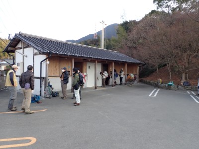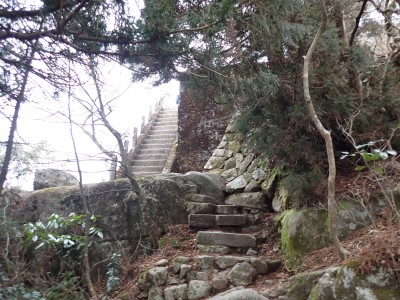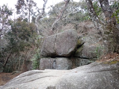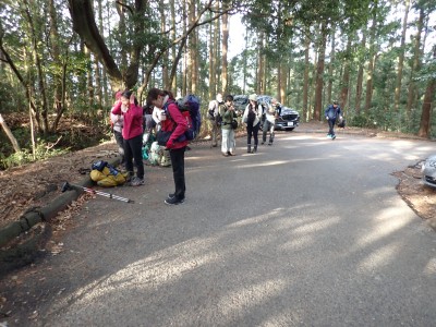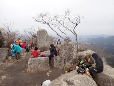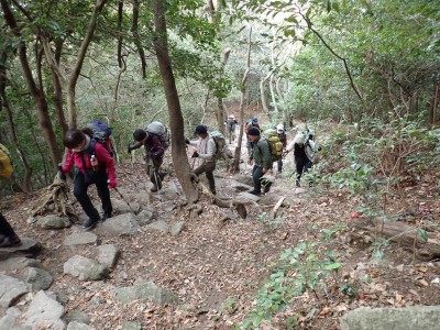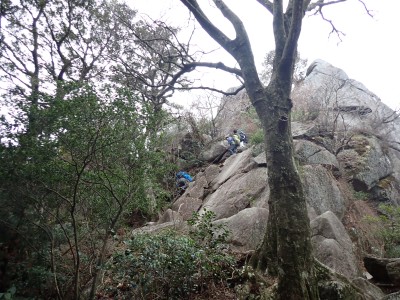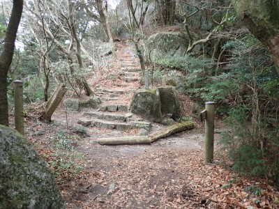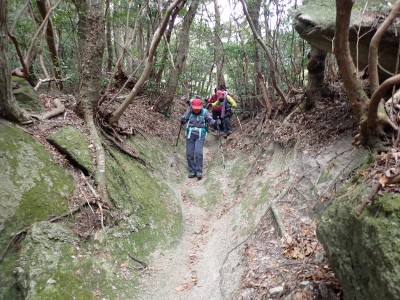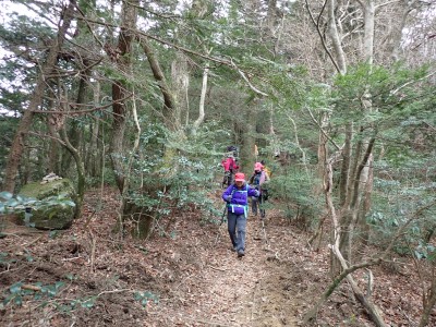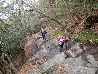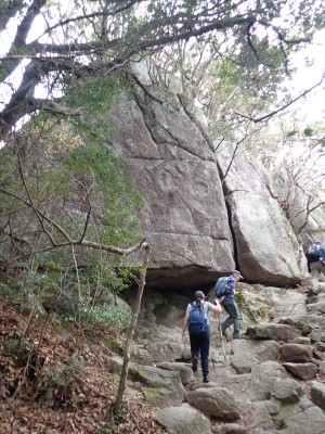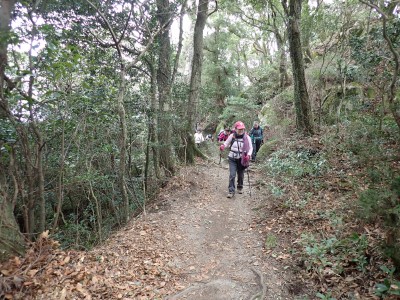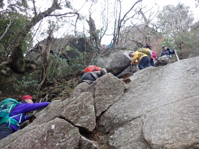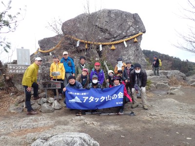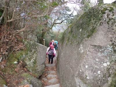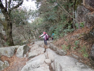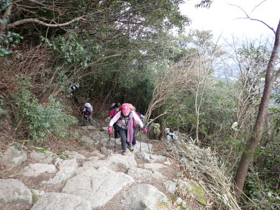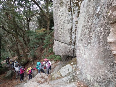 毎年その年の干支にちなんだ山を新年例会として歩く。今年は卯年、ウサギの名が付く山はなかなか近くにない。ふと思い出したのが宝満山の「うさぎ道」だ。山と高原地図(昭文社)を広げる。(と言うか今はスマホにある)「うさぎ道」は意外と長いが歩いたことがないので下見をすることにして昨年の10月に歩いてみたわけだ。その時はうさぎ道を往路に、正面登山道を復路にしたのだが、正面登山道は階段が多く、膝が悲鳴をあげたため逆ルートが良いと判断した。今回は下見の甲斐あって降りは本当に楽な歩きができた。さて天候は雨の兆しもあったが降っても小雨だろうと予想していた。有料駐車場で待ち合わせていたH(男)さんとH(女)さんと合流し、竈門神社のトイレ前でストレッチ、点呼をとり出発。歩き始めるなり会話は弾む。登山口から正面登山道はきつい登りが続くが、ワイワイガヤガヤであっという間に山頂。山頂では大勢の登山者、しかも団体?もしかして渡邊直子さん?そう看護師でもある登山家で有名人である。礼拝岩の前でたくさんの人と記念写真を撮っていた。私はその前でランチをしていたが確証がないままだったので声を掛けることもなかった。私たちも集合写真を撮って下山開始。慎重に岩を降って縦走路からうさぎ道へと降ってゆく。石段だらけの正面登山道とは全く違ってとても緩やかな坂道でとても歩きやすい。もちろん急斜面はジグザグになっている。宇美新道への分岐点を通過し尾根道を進み涸沢を横断したりして舗装道に出る。ここが、うさぎ道の出入り口になるわけだ。雨がポツポツと帽子に当たる。雨具を着るほどでもない。竈門神社で参拝し、駐車場に戻り車に乗ると雨が降り出した。何とも運の良いことだ。ところが太宰府駅方面は大渋滞。「そっか受験シーズンだもんな・・・・。」今日も山に自然に仲間に感謝!!