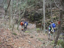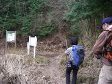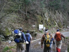| 沢沿い歩き | 林道に出たところ | 自然歩道の案内板を見るメンバー |