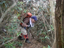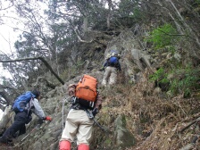 2008年4月13日 天気曇り 自然観察とボランティアの山の会の5月例会登山は犬ヶ岳である。シャクナゲの開花の時期に合わせての計画だ。今日はその下見でCL予定のTさん、代表のYさん、Fさん、Iさん、チューさんの6名でチューさんの車1台で行く事になった。天気予報は曇りのち雨である。AM6時30分 副代表のHさんの会社に集合して出発。 途中、トイレ休憩で築上町の物産館メタセの杜に寄る。 <アクセス> 国道10号線は豊前市の千束交差点(ローソンがある)を求菩提方面へ1本道。資料館より左手橋を渡り、行き止まりのところに登山口駐車場がある。 <コース詳細> 登山口駐車場より山手に見ると道はY字に分かれます。右は恐渕へ(やまめ料理の料亭がある)左はうぐいす谷への道となります。今回はうぐいす谷から笈吊峠へと歩きます。自然林の緩やかな広い道をしばらく歩くと正面に炭焼窯跡があります。右手にカーブして本格的な登山道となってきます。涸れ沢を渡り急登すると経読林道に出ます。林道を右に進むとテーブルと案内板があり、ここから笈吊峠を目指します。小石の坂道をしばらく喘ぐと落葉の道となり上りきると笈吊峠です。一息ついていよいよ30mの絶壁を登るこのコース一番の難所、笈吊岩に挑戦です。以前私たちが上ったのは右手からでしたが左側は新しい鎖があります。しかし、手がかりが少なく危険と判断し、右側を登ることにしました。雨で滑り安く慎重に上ります。(なお、シャクナゲの季節は迂回路を利用するのが賢明)上りきると尾根に出てしばらくシャクナゲの中を歩きます。急登を喘ぎクマザサが多くなり、避難小屋が見えてくると山頂です。山頂で昼食を済ませ次は大竿峠を目指します。途中のピークは二の岳です。今回は大竿峠から恐渕コースを下山します。犬ヶ岳山頂から約30分で大竿峠です。自然林の中を気持ち良く下り沢沿いに下ると経読林道に出ます。林道を右にうぐいす谷方面へ進むとすぐに恐渕への登山口があります。次ページへ |