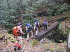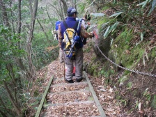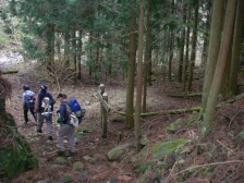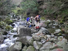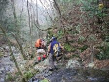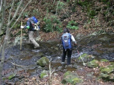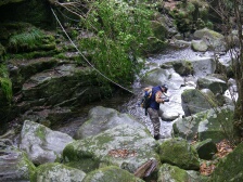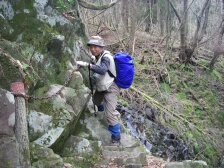 | 前ページから 林道から再び登山道に入りしばらく下ると渓谷沿いの道となります。鎖がある危険な箇所が続きます。滑りやすいので慎重に進みます。滝をいくつか見て下ると見下ろして歩いていた渓谷の下に着きます。ロープが張っていて滑らないように渡ります。炭焼窯跡を見て木橋を渡り、左手に渓谷を見て大きな岩壁が現れます。恐渕です。しばらく渓谷沿いに下り、杉林となり、川原を渡り広い平坦な道を歩くとヤマメ料理店がある登山口に出ます。橋を渡るとうぐいす谷との分岐に出て駐車場に着きます。 <参考コースタイム> 登山口駐車場−(120分)−及吊峠−(70分)−犬ヶ岳山頂−(30分)−大竿峠−(90分)−登山口駐車場 ※あくまでも参考時間です。全行程で約8時間でした。 <まとめ> 恐渕コースを久しぶりに歩きましたが、以前よりも危険なところが多く歩きにくい気がしました。 特に降雨の時は登山道が滑りやすく、川が増水すると渡れなくなる可能性もあるのでこのコースは避けた方が良いと思います。しかし、キツネノカミソリの群生は見応えのあるものと思われます。(うぐいす谷コースでも見れますが) ぜひ、開花の時に訪れたいものです。 |