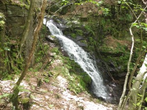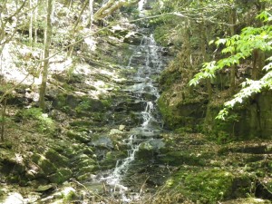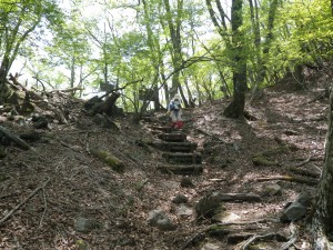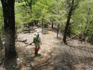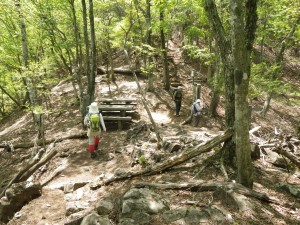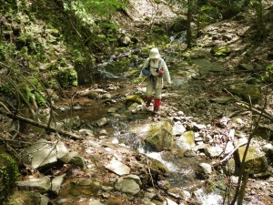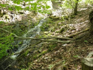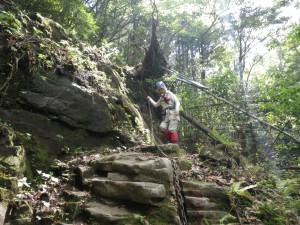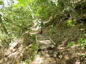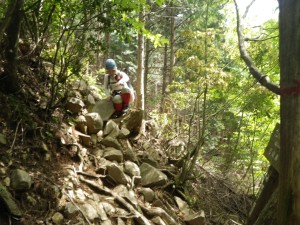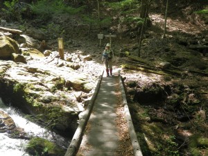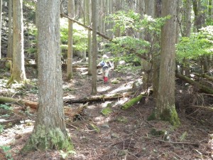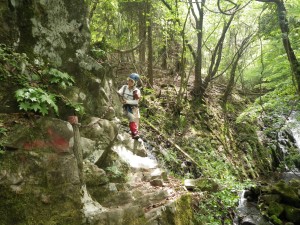 | 杉林をしばらく降る | ちいさな滝がある | 岩場をトラバース |