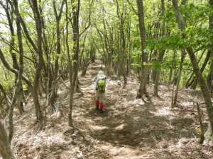 | 前ページから −−犬ケ山頂に−− 笈吊岩から稜線を歩くが、ここからがシャクナゲの群生地である。ほとんどアップダウンのない稜線をシャクナゲの花に囲まれながら進みます。犬ケ岳まで500mの標識を見ると北に求菩提山、東に経読岳が見えてきます。上を見上げると青い空に白骨化した巨木がまさに気骨な姿を見せている。道はやや降るがすぐに上りになる。そして鞍部に出るとここから急登を一気に登る。12時37分、犬ケ岳山頂に着く。展望台の上に立つが、樹木が伸びたのか、展望は得られなかった。といって絶対に切らないで欲しいと願う。山頂は大勢の登山者がランチタイムをとっている。高齢者はもちろん多いがこのところの「山ガール」の流行りか、若い人も多い。食事をしていると後から来たカップルがガスでお湯を沸かし始めた。が、ひっくり返して火が燃え上がり、すぐにガスを止めたようだが、大惨事にならなくて良かった。妻は私に「早く行って消してきて!」と言うが、私がどうなっても良いのかと少し疑った。それにしても山頂はゴミだらけである。空き缶がとにかく捨てられている。どうしてなんだろう?次回はゴミ袋を持ってこようと妻と話したが、これだけあると諦めが先にきそうだ。 −−大竿峠まで−− ランチタイムも無事に終え?12時40分下山開始。山頂から西に二ノ岳を超え、大竿峠を目指す。階段状の道を降り平坦な道になると巨木が多くなる。視界も広がり本当に爽やかである。シャクナゲの花もこれでもかと言うくら見させてくれる。新緑の樹林の中の稜線を気持ちよく歩いて午後1時ちょうど大竿峠に着いた。 −−恐渕を見ながら下山−− 大竿峠から北に恐渕へと降る。谷間の急斜面を降ると水のある沢となりその沢は当然大きくなってゆく。沢のせせらぎも加わり、目・鼻・耳の3つの感覚が活発になる。林道に出ると右に進み少しだけ林道を歩く。分岐標識を見たら階段を降って杉林の中へと降りてゆく。振り返ると石積みが道に沿ってか、おおがかりで組まれていた。昔はここに何かあったのか?・・・・・ 再び沢が見えてくる。ここから右岸沿いに歩く。本流に交わる支流を渡って小さな滝を見ると鎖がある岩場のトラバースを慎重にクリアする。良く頭を打つ家内には、念のためヘルメットを着けてもらう。少し大きな滝を見ると標識に「夫婦渕・登山口2.5km」とあるがどこにあるのか良くわからない。沢の端を歩くと登山道が崩落したのか、迂回する。石のゴロゴロ道を降りきると再び沢が見えてきた。階段状の岩上を滑らないように鎖を持ってゆっくりと降りると鎖が張ってある渡渉だ。向こう岸に見守っているのか子どもを連れた年配の男性がいる。私たちの前を行く人に声をかけて誘導していた。私たちは、腰ベルトから出たシュリンゲのカラビナを鎖にかけ、安全に渡る。大げさかもしれないが、いざという時の訓練にもなる。左岸に渡たり、水量は少ないが落差30mほどもある滝を右に見て登山口2kmの標識を見ると木の橋があり再び右岸を歩く。ここら辺りから恐渕と言うのか沢が深くなり渓谷らしくなってきた。登山口1.7kmの標識を見ると渓谷の水は見えなくなり右手の岩壁に気がとられるようになる。板状の岩が面白い。キツネノカミソリの葉と椿の落ち花が道に広がり絨毯のようで高貴な気分になる。やがて杉林の道となり小さな沢を横断して林道になるとヤマメ料理の茶房に出た。車道を少し歩くと出発点の駐車場に着く。時計を見ると午後2時53分 だった。 ■コースタイム 登山口−(50分)−林道−(35分)−笈吊岩−(60分)-犬ケ岳山頂−(20分)−大竿峠−(17分)−林道−(20分)−夫婦渕標識-(75分)−登山口 ※休憩時間は含んでいません。全行程で約5時間かかりました。 ■おまけの温泉 家内のリクエストで卜仙の郷(ぼくせんのさと)に立ち寄る。 |