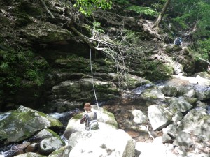 | 滑りやすい岩場 | 渡渉点 水位が上がると手こずりそうだ | 落差30mくらいありそう |