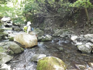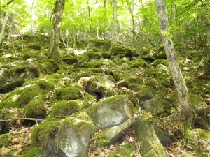 | 木の橋を渡る | ここら辺りが恐渕(進行方向左手) | 右手を見ると苔むした石がたくさんある |