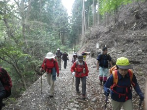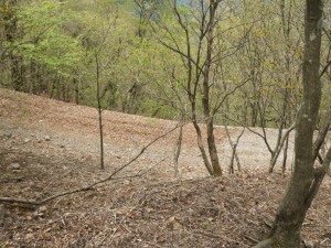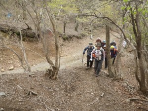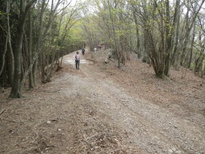 | 作業道を横断 | 植林帯と自然林の間を降る | 作業道を歩いている |