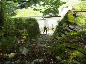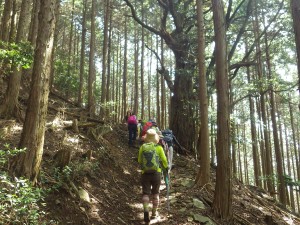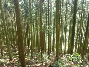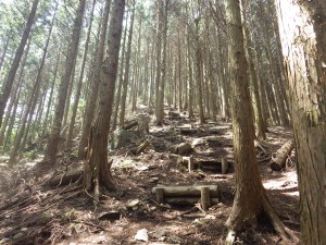 | 求菩提山登山口 | 急な石段を進む | きれいな植林だ |