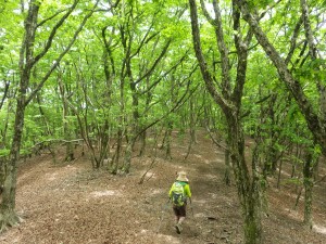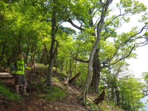 2015年5月17日(日) 天気 晴れ ■出発時間:午前7時頃 自宅 ■メンバー:家内と私の2名 前日、天気も回復しそうだし、さあーどこの山に行こうか?と家内と話す。ヤマシャクヤやシャクナゲの花の時期は終わり、ミヤマキリシマはちょっと早い。悩んだ挙句、家内が『やっぱり新緑じゃない』の一言で「犬ケ岳」となった。昨年の5月にアタック山の会で犬ケ岳を求菩提山まで縦走したが、私のとても好きなコースで今回はちょうど逆コースを歩くことにした。 道の駅「豊前おこしかけ」で弁当を仕入れ、求菩提公共駐車場に車を停める。 数台の車が駐車されていて登山者が求菩提山目指し、出発していた。 私たちは求菩提山の頂上はパスするので南側の登山口から歩き始める。植林帯をいきなりの急登できつい。団体さんを追い越すと分岐点に着く。ここからは岩壁沿いに窟を見学しながらの道である。何度見てもすごい景観である。 道がジグザグになって松林を登りきると護摩場跡に着く。ここからも求菩提山の頂上に行ける。 ここから長い尾根歩きが始まる。しばらく植林帯の中をアップダウンしながら進む。虎の宿を通過すると予想通り新緑の素晴らしい樹林帯となる。杉の宿、林道の分岐点とアップダウンを繰り返し、一の岳へ到着。頂上では数人の登山者がランチタイムをとっていた。私たちもこの辺りで食事とした。今日は何と言っても初めての周防巻を食べれる。鯖寿司であるが昆布と大根を巻いていて間に柚子と胡麻や小ねぎも入っていて鯖の臭みがないので家内もおいそうに食べてくれた。 腹ごしらえを済ませ、まずは大竿峠へ下る。ここで団体さんが昼食をとっていたが、岩場の直下は落石もあるのでリーダの方は注意をしていただきたいものである。 ここからは今までと違って周りの展望も楽しみながら歩ける。また、ミズナラのきれいな林もあって飽きない。 犬ケ岳山頂は1組の登山者だけで静かである。既に下山したのであろう。笈吊岩は迂回路を行く。以前よりもずいぶん歩きやすくなった感じがする。笈吊峠から木の階段ができている。以前よりもはっきり言って歩きずらい。林道に出て再び登山道を歩き無事犬ケ岳登山口。ここから車道を出発地点の公営駐車場まで歩く。駐車場に着くとずいぶんと歩いたようで足が痛くなっていた。 新緑と変化に富んだ素晴らしいコース。今日も山に自然に感謝!! ■コースタイム 公営P-(45分)-護摩場跡-(25分)-虎の宿-(45分)-杉の宿-(45分)-一の岳-(20分)-大竿峠-(30分)-犬ケ岳頂上-(45分)-笈吊峠-(70分)-犬ケ岳登山口-(20分)-公営P ※休憩時間含まず。全工程で約7時間。(距離 14.1km 標高差788m) |